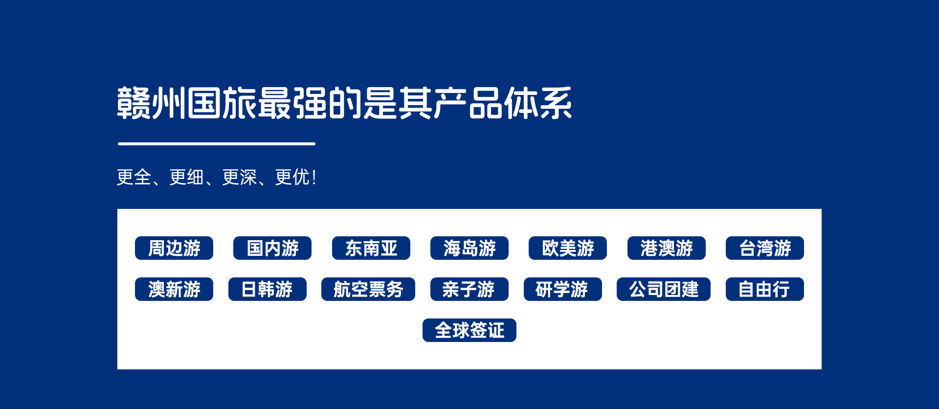 赣州国际旅行社有限公司,简称赣州国旅,成立于1989年,至今拥有36年悠久历史,是江西省中南部成立早的国际旅行社,是经国家旅游局批准的赣州首家具有出境旅游资质的组团社、唯一一家具有台湾旅游资质的组团社、赣州唯一荣获国家级表彰的全国旅游行业先进集体。